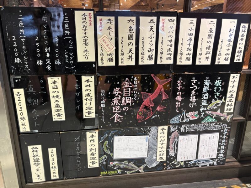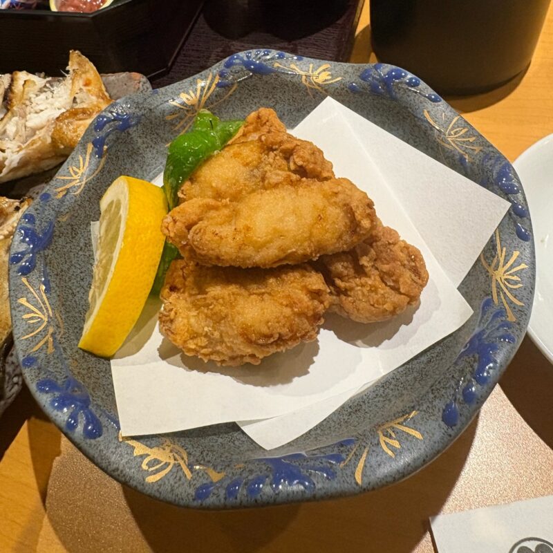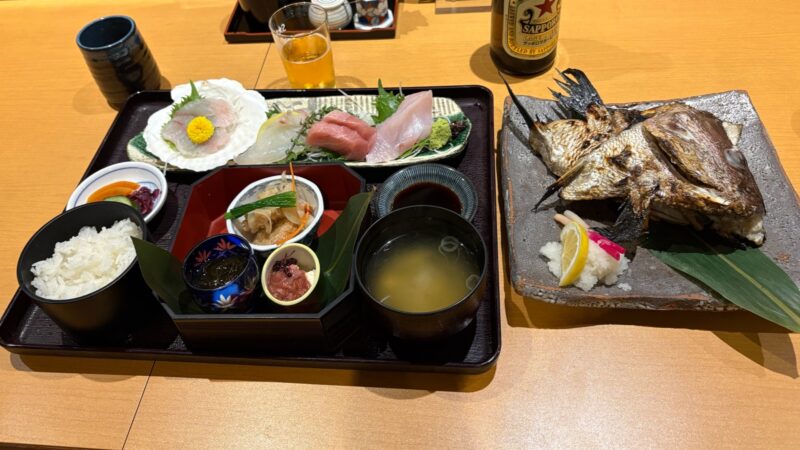 旅の始まりは、品川から東海道線で小田原へ。新幹線ならあっという間だけれど、あえて在来線でゆっくりと旅気分を味わうのも良い。小田原に着いたら、まずは駅前の「魚國」で腹ごしらえするのが、最近のお決まりになっている。いつもは定食メニューから選ぶのだが、この日は「豪華!魚国膳」(税込4,120円)を夫婦でシェアした。真鯛カブトの塩焼きは少し時間がかかるそうだが、この日は特に急がないのでゆっくり待つことに。目の前で時間をかけて焼き上げてくれる。新鮮なお刺身やふぐの唐揚げなどに舌鼓を打つ。とても一人では食べられない量なので、シェアして正解。