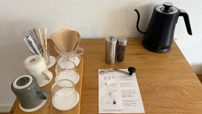 「冷蔵庫内ドリンク無料プラン」を選択したが、冷蔵庫には小さな缶ビール、お茶のボトルとお水。正直期待外れだった。豆から挽けるコーヒーセットがあるところがポイント。カフェに行けば、無料でコーヒーを淹れてくれるが、自分で豆を挽いて淹れる時間も、旅の楽しみのひとつだ。