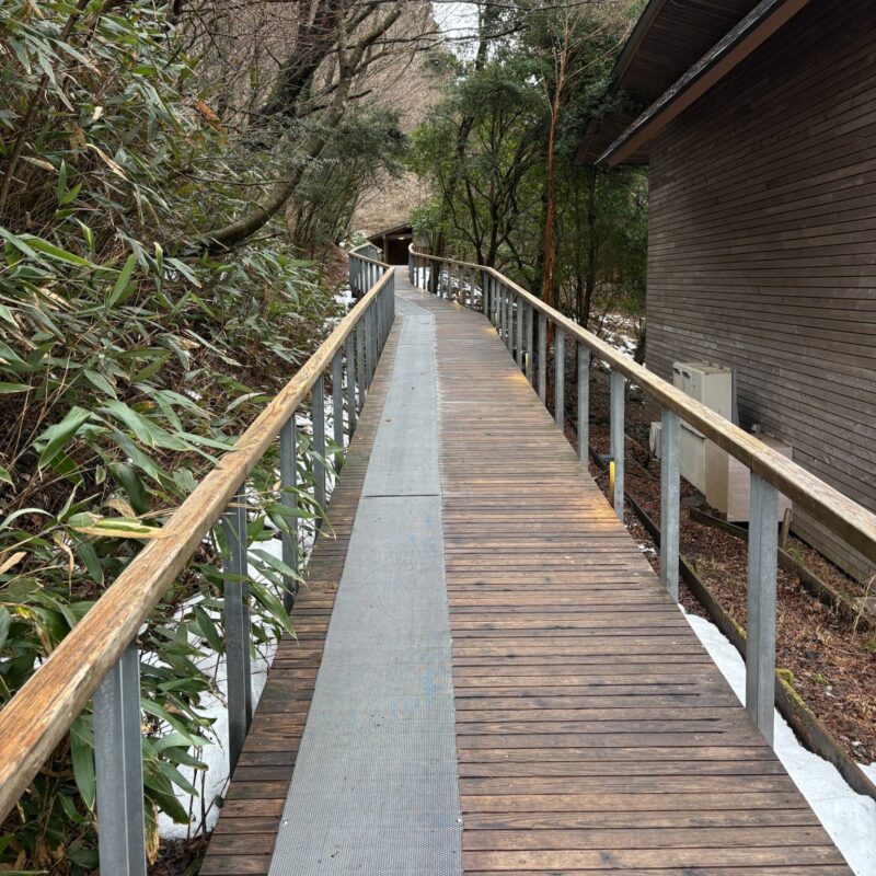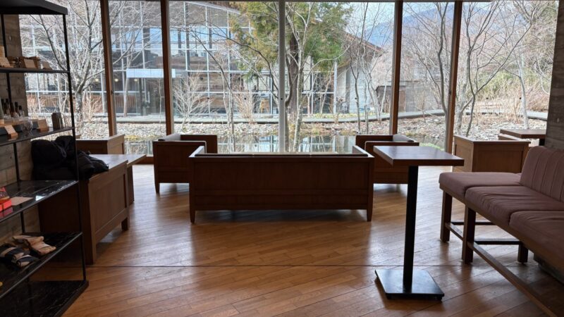 そこから客室までは別棟。カフェも温泉も別棟なので、敷地内の行き来はすこし不便に感じた。敷地内は部屋に置いてある作務衣風の館内着と半纏風の防寒具、そしてチェックインの時に頂ける靴下で過ごせるが、真冬に外を行き来するには少し寒い感じもした。