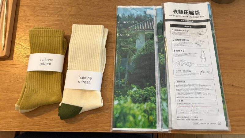 チェックイン時には、可愛らしいソックスと衣類圧縮袋のプレゼントが。ソックスはお土産にもぴったりで、思わず追加で購入してしまったほど。一休のダイヤモンド特典でいただいた館内利用券は、カフェのスイーツとお土産の靴下に消えていった。