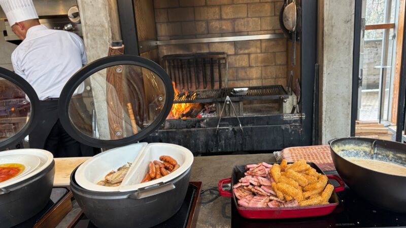 朝は早起きして、もう一度温泉へ。冷たい空気の中で入るお風呂は、格別の気持ちよさ。朝食はビュッフェ形式で、品数は多くないけれど、どれも丁寧に作られているのが伝わってくる。焚き火で焼くオープンサンドや、湯葉と山芋のとろろ汁、オリエンタルホテル特製のスパイシーカレーまで。朝から贅沢な時間だった。