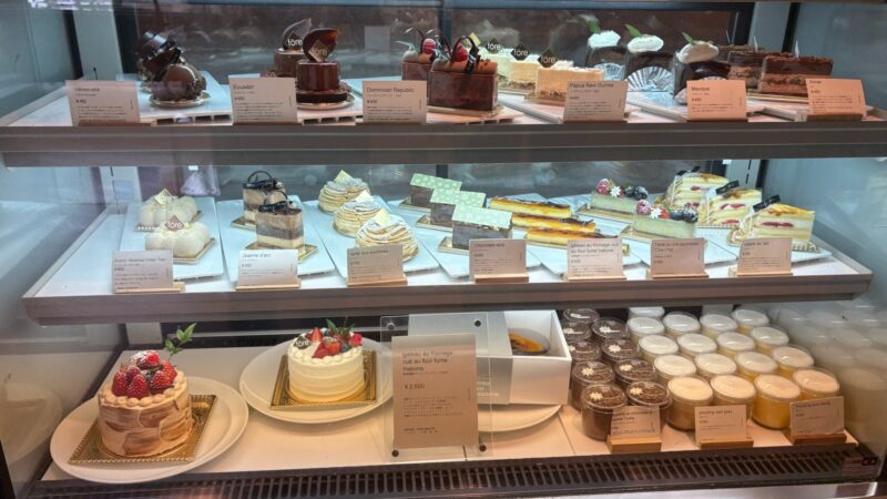 客室でひと息ついた後は、カフェラウンジへ。ここが、想像以上に素晴らしかった。宿泊者は淹れたてのコーヒーや紅茶を自由に楽しめるうえ、ケーキのクオリティが驚くほど高い。世界各地のカカオを使ったチョコレートのタブレットが並び、試食ができる。ショーケースには本格的なショートケーキが並んでいるが、値段は驚くほどどれもリーズナブル。コーヒーはオリジナルブレンドで少し酸味が強いが、カフェラテにすれば絶品。気に入ったチョコレートを使ったケーキを注文し、カフェラテとともにゆったりとした時間を過ごした