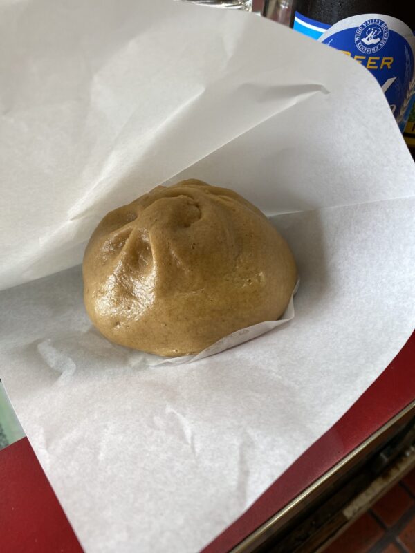 朝食はたっぷりと食べましたので、お昼は軽くと考えて、大室山のリフト乗り場のレストハウスで「猪まん」と「海鮮しらすまん」(各350円)、地ビール(1本450円)を頂きました。