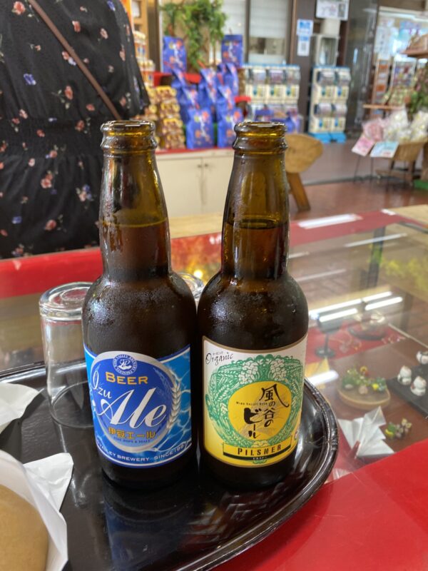 地ビールは「風の谷ビール」のピルスナーと伊豆エールです。1本450円は格安です。